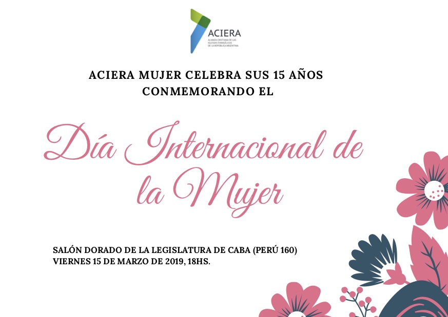 El departamento femenil de la Alianza Cristiana de Iglesias Evangélicas de la República Argentina cumple quince años de vida. Como lo hace desde el año 2004, entregará las placas ACIERA Mujer en el acto conmemorativo del Día Internacional de la Mujer en el Salón Dorado de la Legislatura porteña, sita en Perú 160, Ciudad Autónoma de Buenos Aires, el próximo viernes 15 de marzo a las 18 horas.
