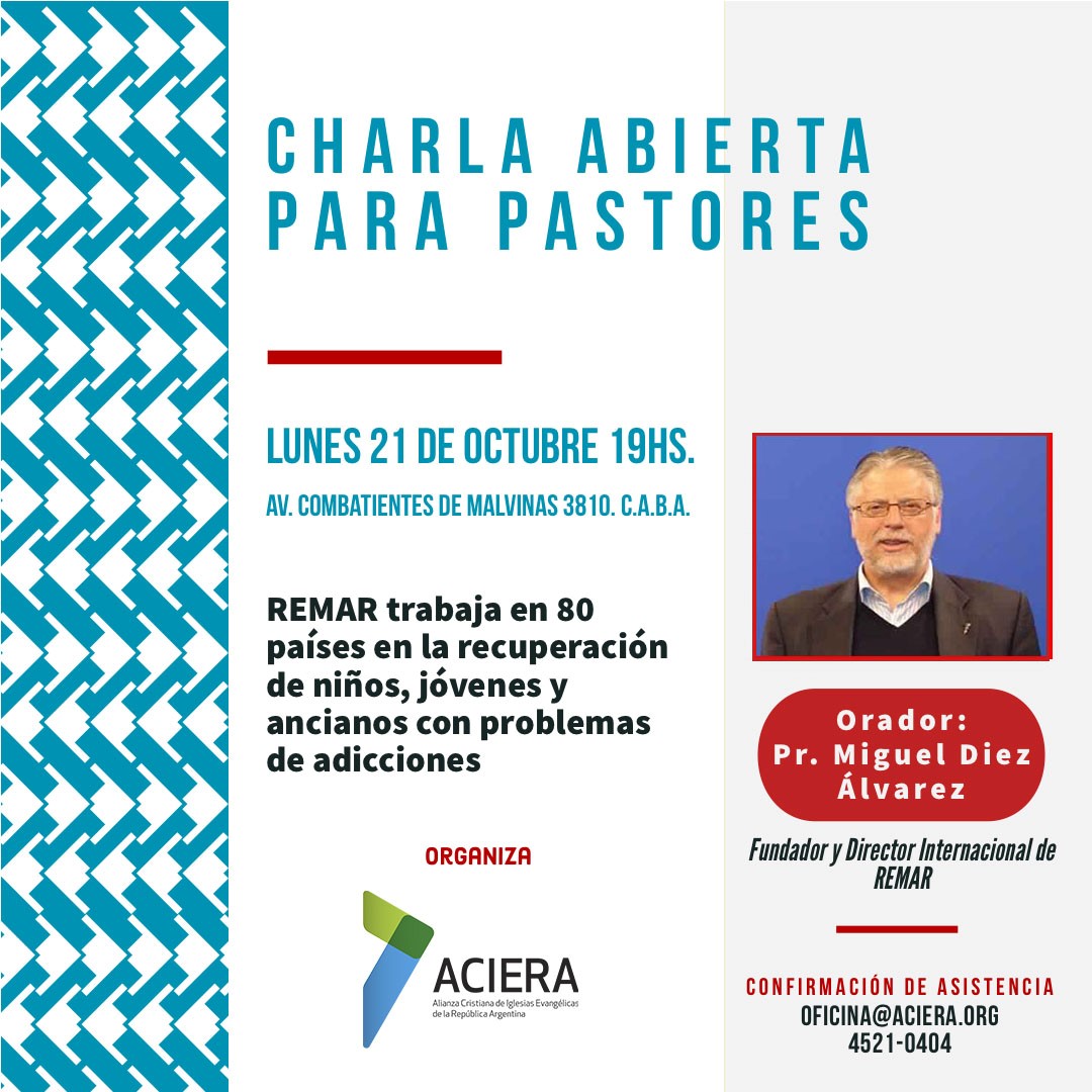 No se pierda esta gran oportunidad de compartir con un hombre de amplísima visión y acción que honra a la iglesia evangélica en todo lugar. Ya lo sabe. Los esperamos el lunes 21 del corriente mes a las 19 horas en Avenida Combatiente de Malvinas 3810, sede de ACIERA.