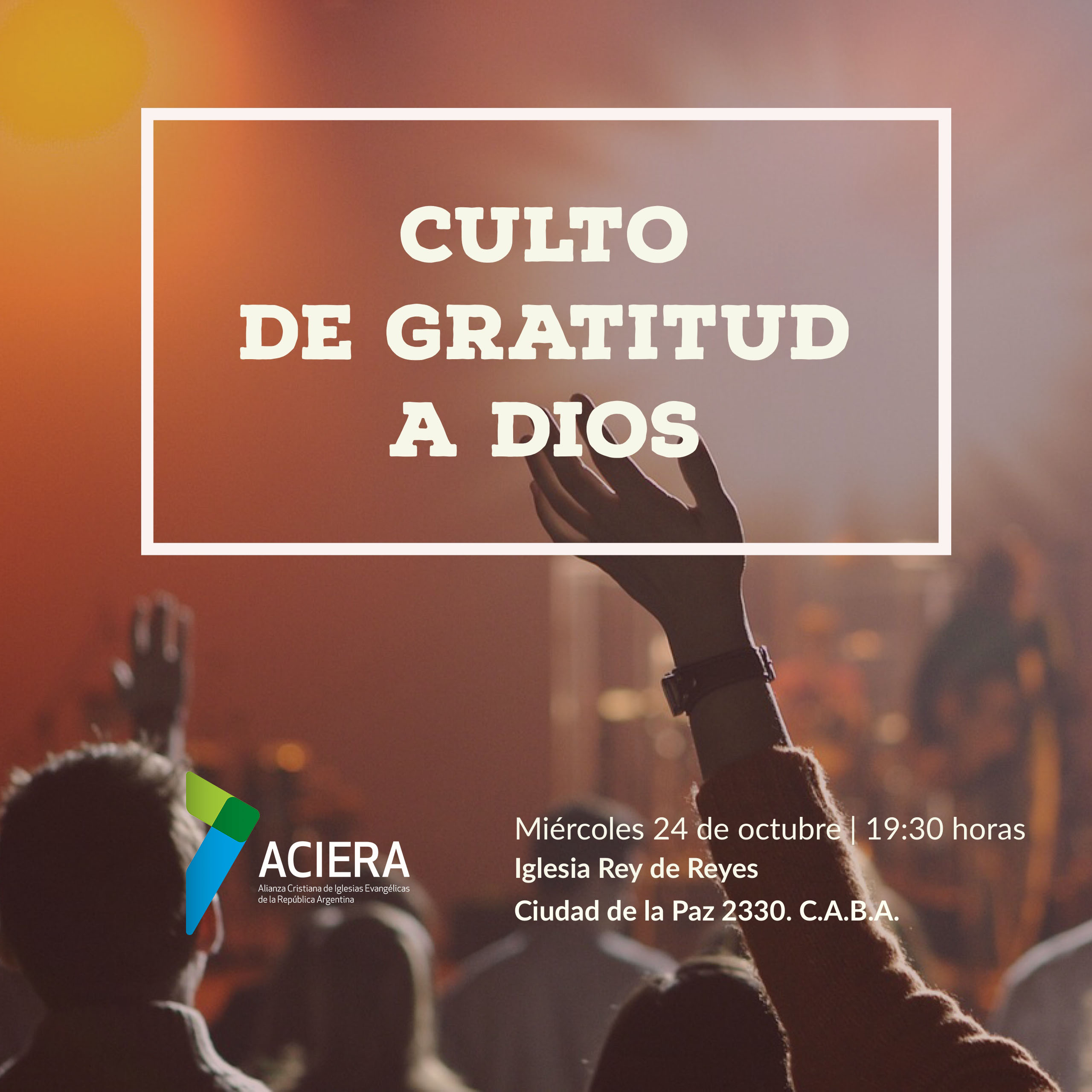 ACIERA convoca a participar a un culto de gratitud a Dios, anteriormente llamado Tedéum Evangélico, el día miércoles 24 de octubre a las 19:30 horas en la Iglesia de Rey de Reyes, sita en la calle Ciudad de la Paz 2330, Ciudad Autónoma de Buenos Aires, con el propósito de dar honra a nuestro Dios, como un testimonio público de nuestra fe en Cristo Jesús. Se invitará autoridades en el orden nacional y local. Les animamos a reservar dicha fecha, en donde juntos levantaremos en alto el nombre del Señor Jesús.