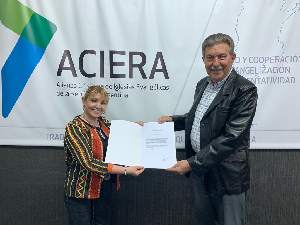El lunes 25 de noviembre, jornada en que se celebró el Día Internacional de la Libertad Religiosa, la Diputada Nacional Alicia Soraire, autora del proyecto de Ley denominado “Día de la Libertad Religiosa”, el cual cuenta con media sanción de Diputados, entregó al Presidente de ACIERA, pastor Rubén Proietti, la carpeta que contiene el texto íntegro de dicho proyecto, sus fundamentos, y las presentaciones realizadas oportunamente al titular de la Cámara de Diputados de la Nación, Dr. Emilio Monzó, el pasado 8 de abril.