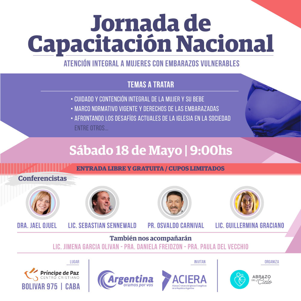 Es en ese sentido que con la organización de “Abrazo del Cielo”, ACIERA y Argentina Oramos por Vos invitan a una gran jornada de capacitación para todas aquellas iglesias y organizaciones que quieran brindar un servicio de acompañamiento, contención y cuidado a las madres con embarazos no previstos o vulnerables, y a sus bebés. Esto será el sábado 18 de mayo a partir de las 9 horas en Bolívar 975, en las instalaciones del Centro Cristiano Príncipe de Paz, en el barrio de San Telmo, Ciudad Autónoma de Buenos Aires.