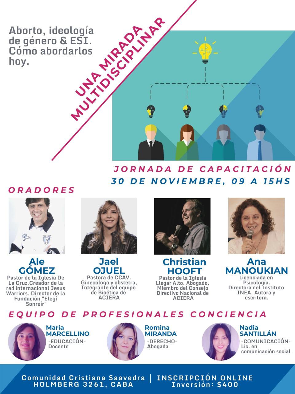 Entre los oradores se presentarán el pastor y abogado, Christian Hooft; la doctora en psicología, Ana Manoukian; la doctora en ginecología y obstetricia, Jael Ojuel; la docente María Marcellino; la Dra. Romina Miranda y la Licenciada en Comunicación, Nadia Santillán. Contaremos con la participación de Alejandro Gómez, pastor de la iglesia De La Cruz, y Director de la Fundación Elegí Sonreir.