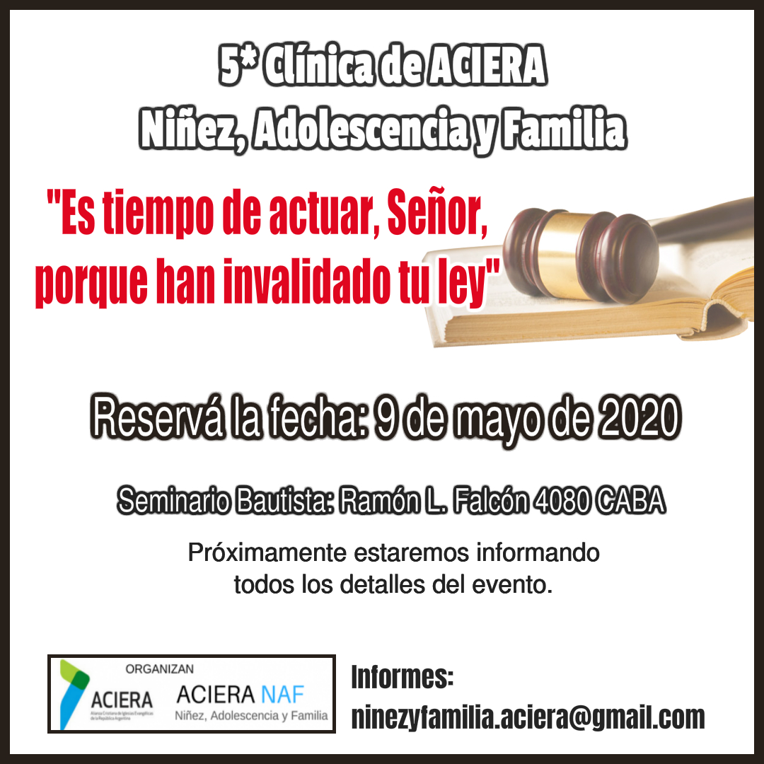 La Alianza Cristiana de Iglesias Evangélicas de la República Argentina (ACIERA), a través de su Departamento de Niñez, Adolescencia y Familia ya está ultimando los detalles para la realización de la Quinta edición de su Clínica sobre esta temática a nivel nacional que tendrá lugar el próximo sábado 9 de mayo en las instalaciones del Seminario Internacional Teológico Bautista (SITB), sito en calle Ramón Falcón 4080, en el barrio de Floresta, en la Ciudad Autónoma de Buenos Aires. Una iglesia comprometida debe tratar desde la prevención estos temas y debe capacitarse regularmente para estar a la vanguardia contra los flagelos que acechan hoy con más crudeza a nuestros niños y adolescentes. Pastores, líderes, maestros de escuela dominical, y familia en general deben estar presentes para capacitarse.