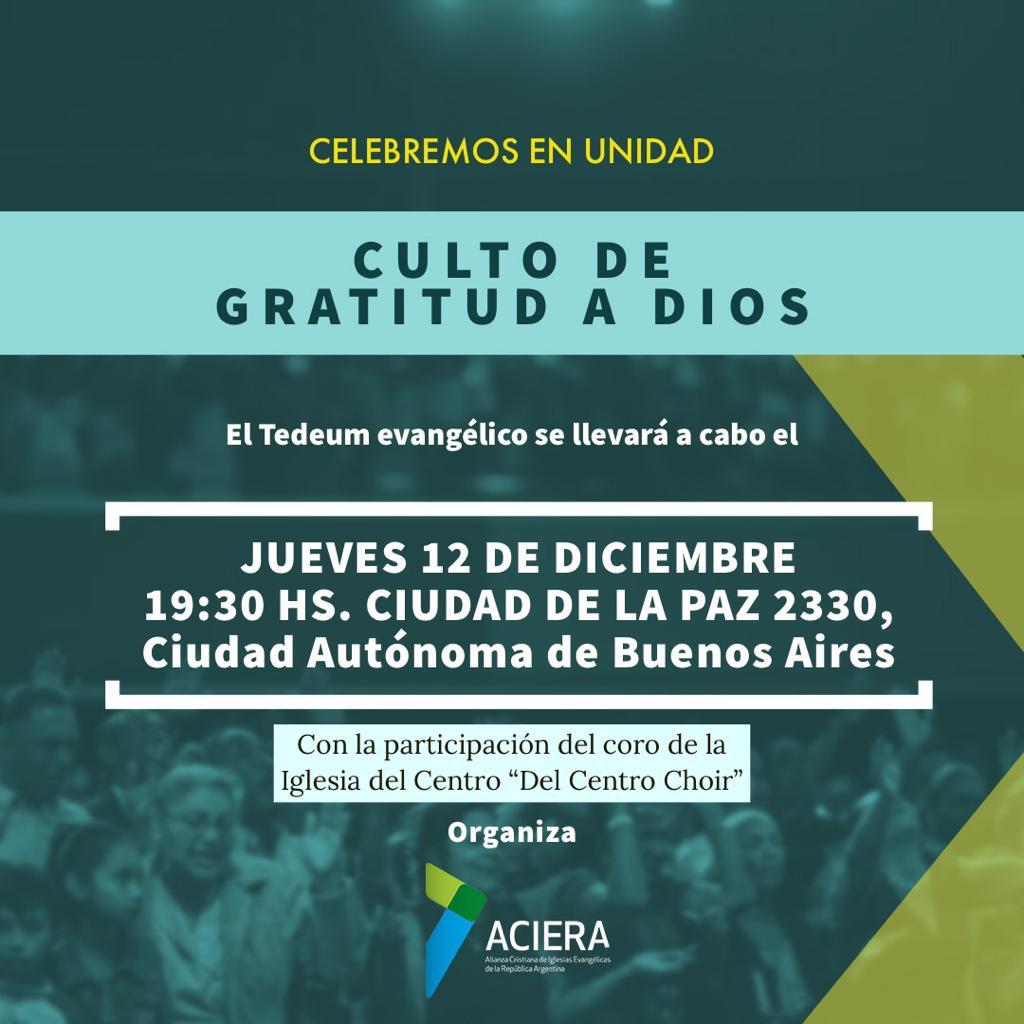 A las 19.30 se dará comienzo en el mismo recinto el Culto de Gratitud a Dios, donde será orador Rubén Del Ré, director general de Sociedad Bíblica Argentina (SBA), y participarán el Coro de la Iglesia del Centro «Del Centro Choir» y el grupo de alabanza y adoración de Rey de Reyes. Y en donde, en el marco de gratitud al Señor y delante de las autoridades gubernamentales e institucionales que serán invitadas, alabaremos e invocaremos JUNTOS y UNÁNIMES a Nuestro Señor.