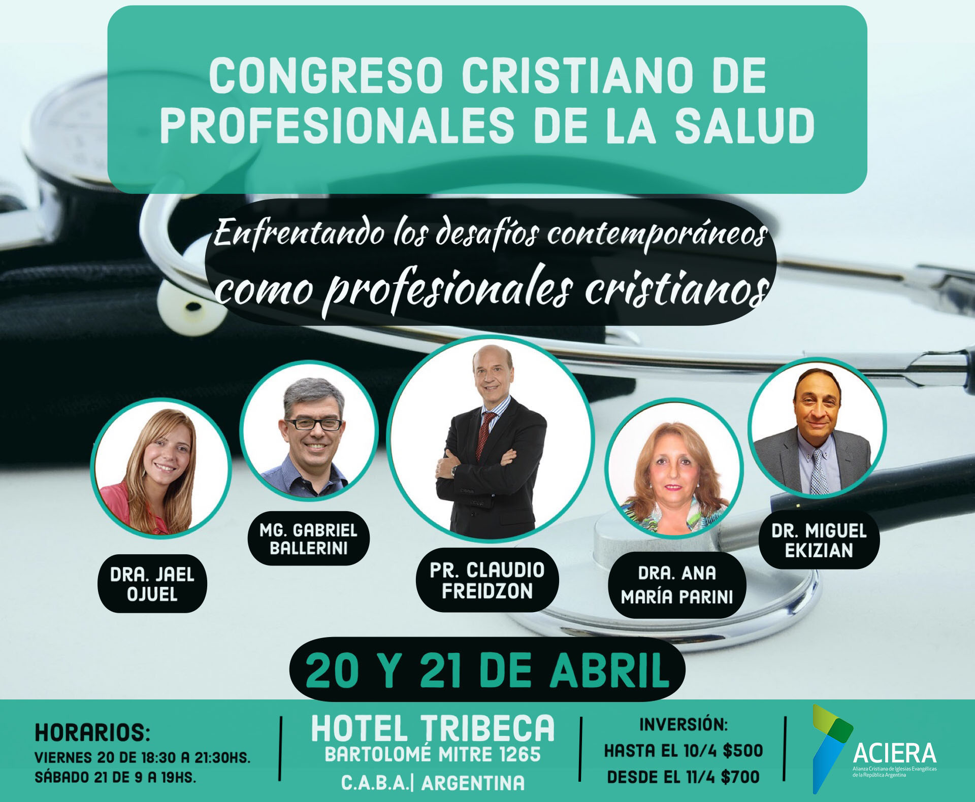 Durante los días 20 y 21 del corriente mes todos los profesionales cristianos de la salud tendrán su encuentro en el marco del Primer Congreso Cristiano de Profesionales de la Salud que organiza ACIERA, cuyo propósito es ver la profesión a la luz de la Palabra y el rol de profesional cristiano en los distintos ámbitos en que se desempeña. Tendrá como lema «Enfrentando los desafíos contemporáneos como profesionales cristianos».