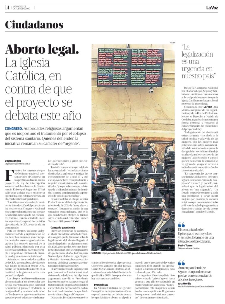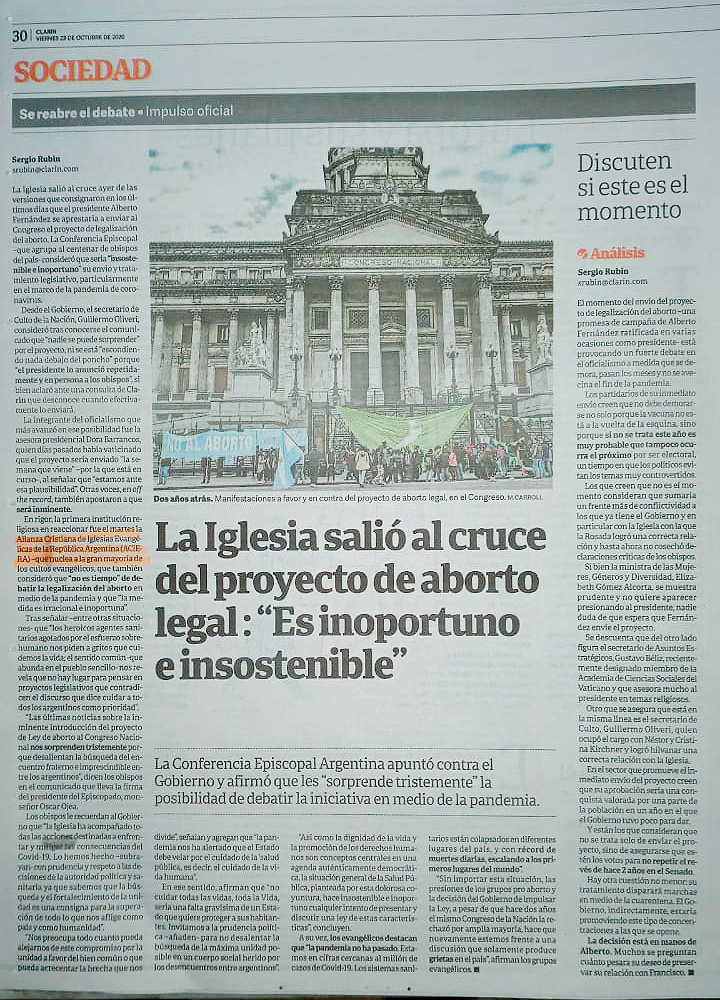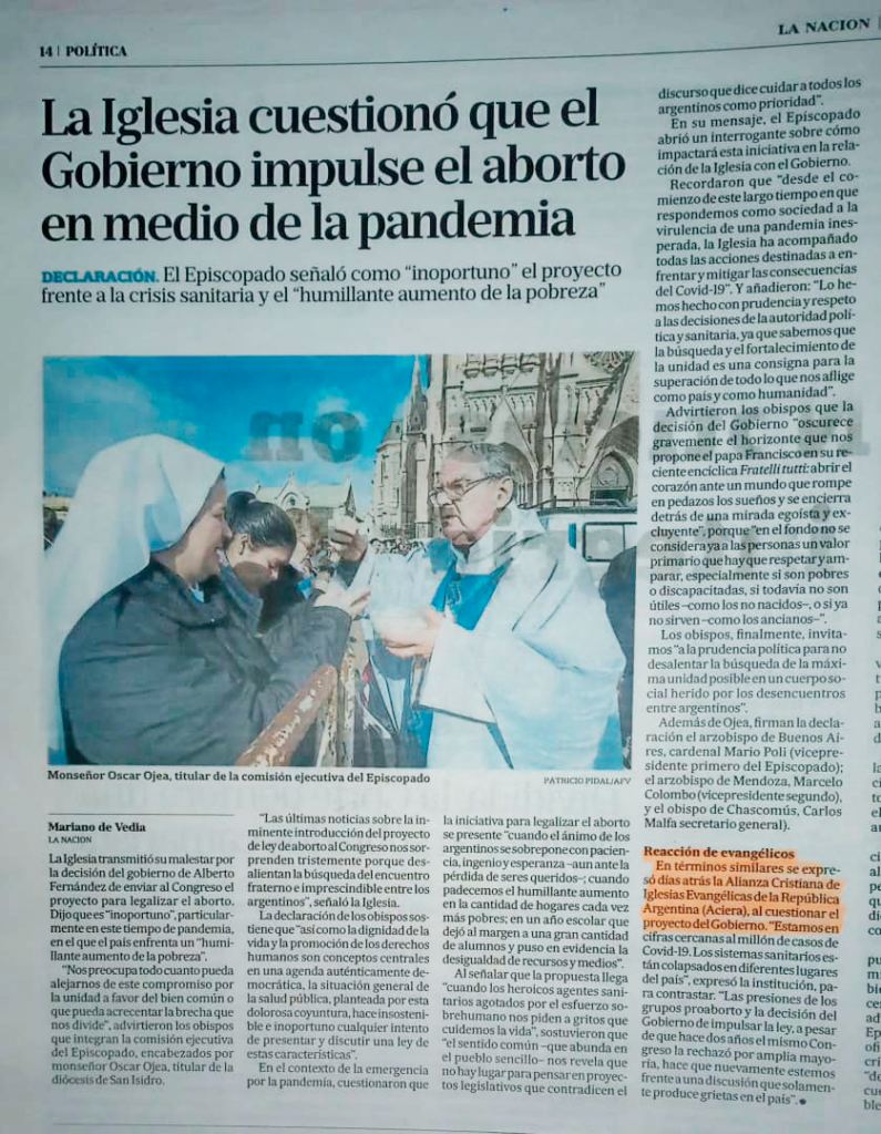 El día jueves 22 de octubre, tres días después del comunicado de ACIERA, se da a conocer el comunicado de la Conferencia Episcopal Argentina en el mismo tenor. Donde, por ejemplo en el diario La Nación (Ver Nota aquí), no sólo habla del comunicado católico, sino que de la mano del periodista Mariano De Vedia, se hace una referencia casi completa al comunicado emitido el día lunes por esta Alianza. Como también lo hizo el portal de Infobae (Ver Nota aquí) y el de Todo Noticias (Ver Nota aquí). De igual manera lo manifiesta la publicación que dirige Sergio Rubín de Clarín, Valores Religiosos, que en el primer párrafo de la nota titulada “Aborto: Para la Iglesia sería “insostenible e inoportuno” que se enviara ahora el proyecto” (Ver Nota aquí), resalta que “Evangélicos ya habían manifestado su oposición al debate en medio de la pandemia” en relación al documento del 19 de octubre.