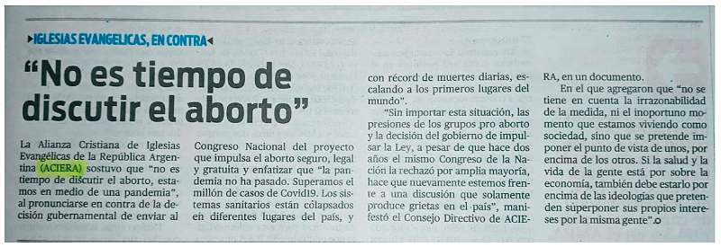 Los medios de Comunicación comenzaron a reflejar tímidamente la postura de las Iglesias Evangélicas representadas por ACIERA, aunque hubieron titulares como el de Perfil: «Evangélicos piden postergar la discusión del aborto legal: «Estamos en medio de una pandemia”», que dan muestra de la impronta que ACIERA le imprime a la situación.