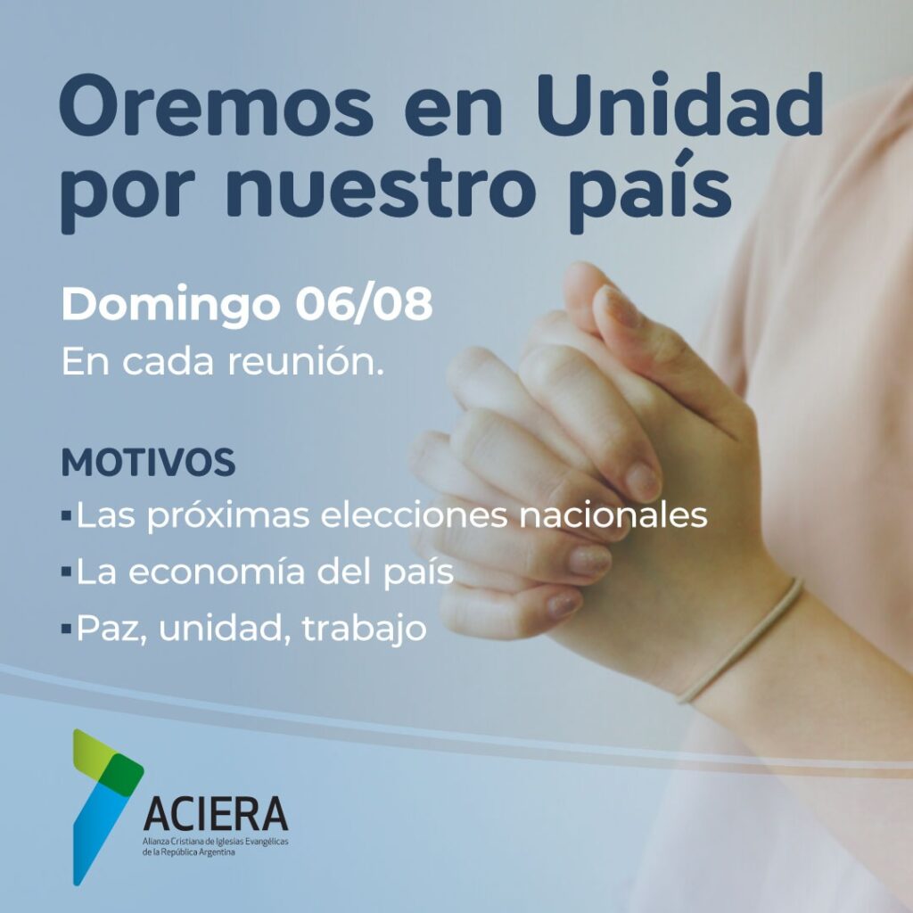 La Alianza Cristiana de Iglesias Evangélicas de la República Argentina anima a los creyentes de las iglesias que representa, a elevar una oración por el país y el próximo acto electoral. Este domingo 6 de agosto en cada reunión, templo o espacios que se considere oportuno llevaremos adelante esta acción.