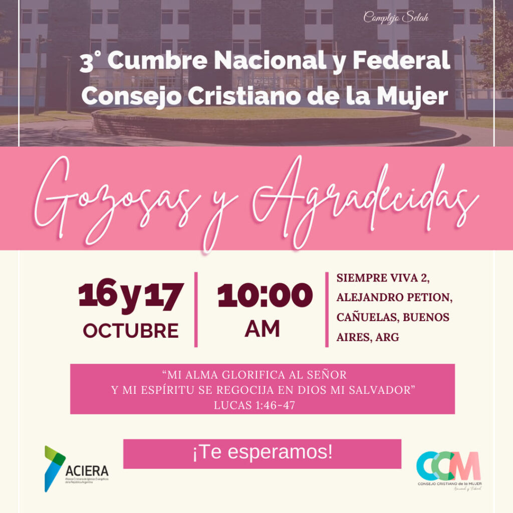 Y cerrando añadió “Es un tiempo re difícil el que transitamos en lo económico, en lo social, en lo ministerial, pero eso no quita que tengamos que propiciar el hecho de tomar tiempo de estar juntas en la presencia del Señor. Vamos a tener tiempos de oración, de compartir charlas y experiencias. Además habrá oradoras de prestigio, de primer nivel, en cuanto a exponer su palabra, de exponer su fe. Las esperamos!»