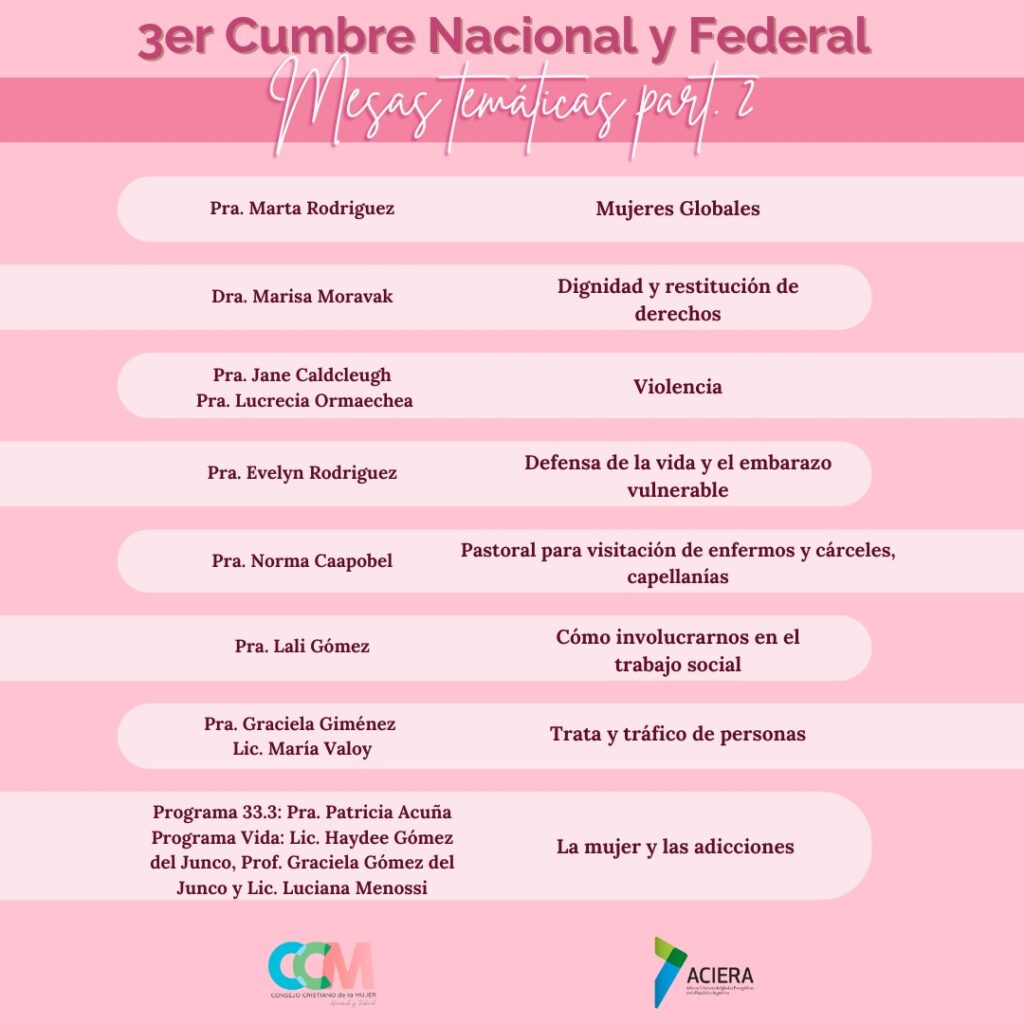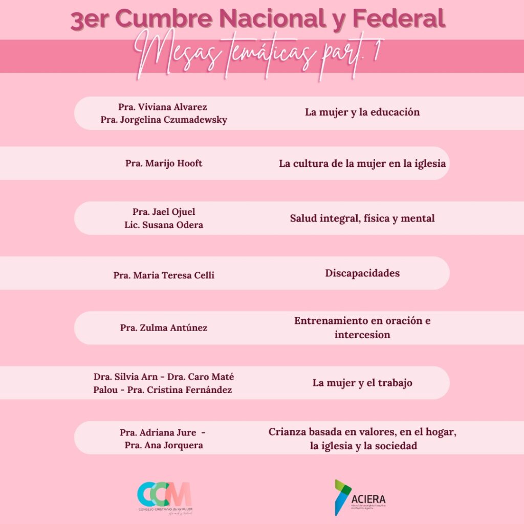 Este encuentro es una oportunidad ideal para que líderes de las distintas provincias puedan adorar juntas, crear redes de trabajo en unidad, por medio de distintas mesas temáticas que abarcan gran variedad de áreas: entre ellas podemos destacar: La mujer y el trabajo; Nuestro corazón misionero; Entrenamiento en oración e intercesión; Pastoral para visitación de enfermos y cárceles, capellanías; Salud integral, física y mental; Trata y tráfico de personas; Violencia; Programa Vida; La mujer y las adicciones – Programa 33.3; Cómo involucrarnos en el trabajo social; Discapacidades; Defensa de la vida y embarazo vulnerable; Dignidad y restitución de derechos; Crianza basada en valores, en el hogar, la iglesia y la sociedad; La cultura de la mujer en la iglesia; La mujer y la educación.