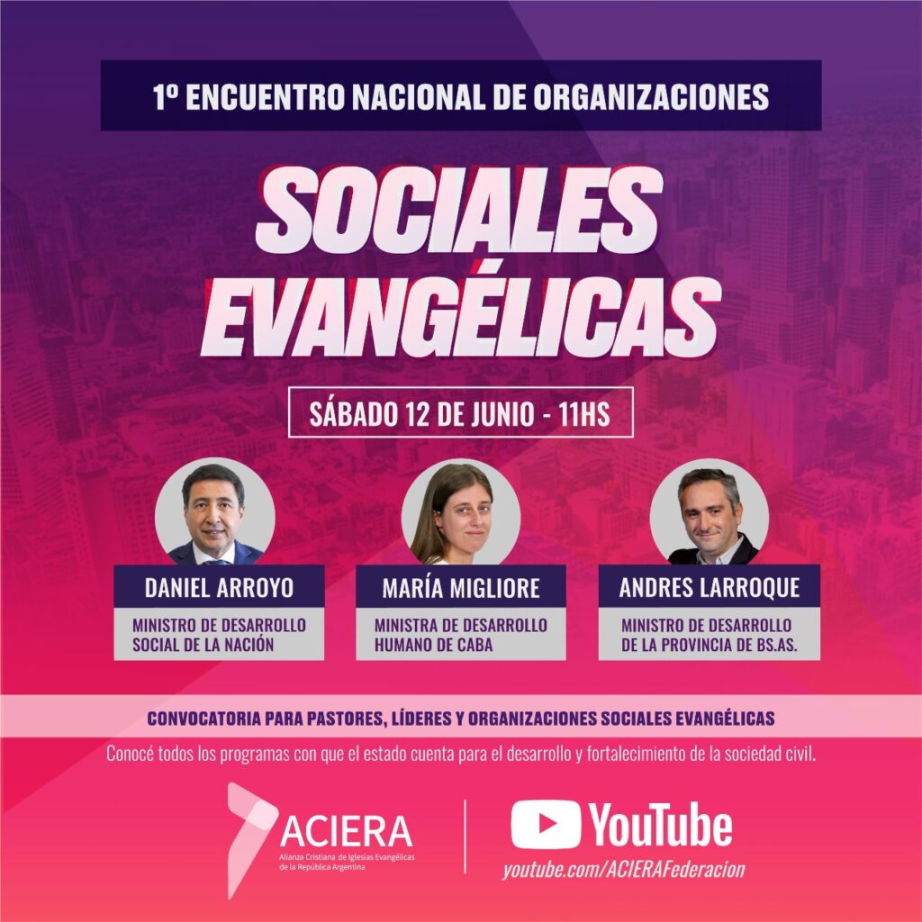 Buenos Aires, 3 de Junio de 2021 — ACIERA convoca a los titulares del área social de gobierno por la Nación al Ministro de Desarrollo Social de la Nación, Daniel Arroyo; al Ministro de Desarrollo de la Provincia de Buenos Aires, Andrés Larroque; y a la Ministra de Desarrollo Humano de CABA, María Migliore a un encuentro con las diferentes organizaciones cristianas que trabajan en diversas áreas de ayuda y contención social, para el sábado 12 de junio a las 11hs. con inscripción previa.