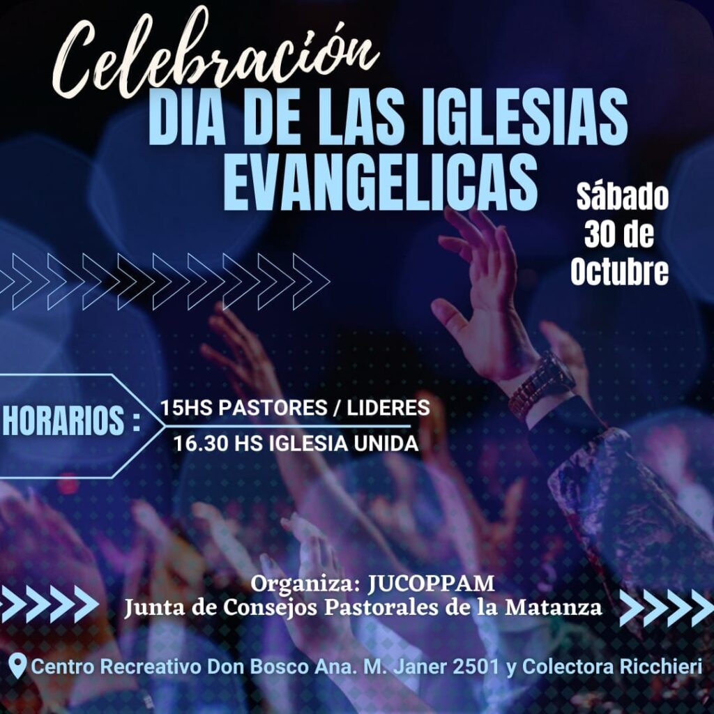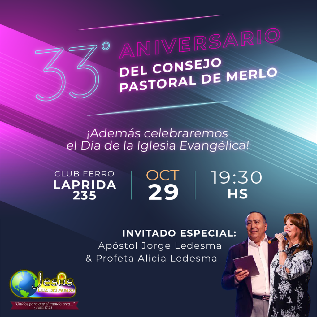 Por esta razón, en muchos lugares habrán actos recordatorios con actividades afines. Hoy, 29 de octubre a las 19:30hs en el Club Ferro de Merlo (Laprida 235) se llevará a cabo la celebración de los 33 años de servicio del Consejo Pastoral de Merlo y la Conmemoración del Día de la Iglesia Evangélica con la participación especial del pastor Jorge Ledesma y su esposa Alicia.
