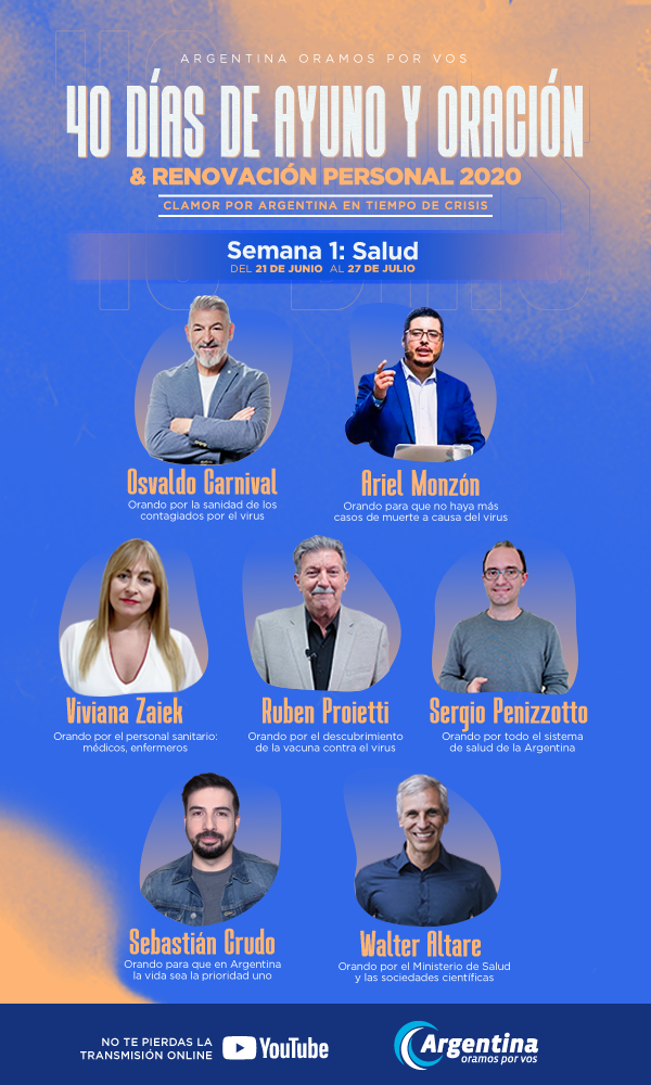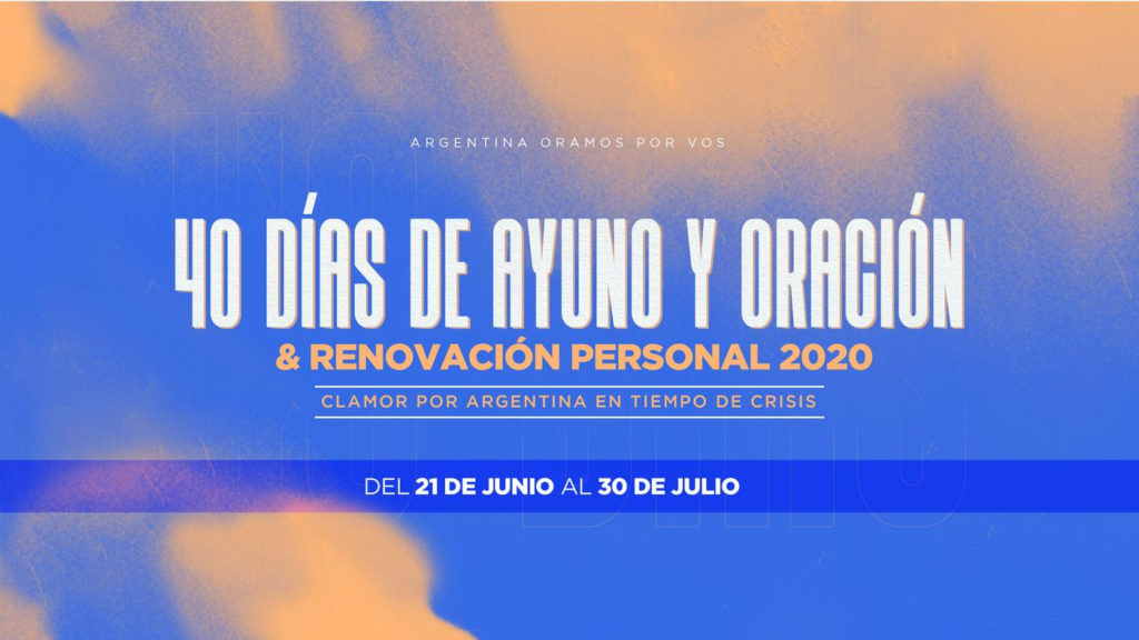 Dada la situación de público conocimiento que le toca vivir a toda la población mundial, el movimiento de intercesión, oración y unidad Argentina Oramos por Vos convoca a todas las congregaciones del país a unirse desde el próximo domingo. Reuniendo así, a más de medio millón de intercesores y representando aproximadamente a tres mil congregaciones, para comenzar la décima edición de la campaña denominada 40 Días de Ayuno, Oración y Renovación Personal, y así levantar un “clamor por Argentina en este tiempo de crisis”.
