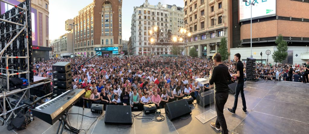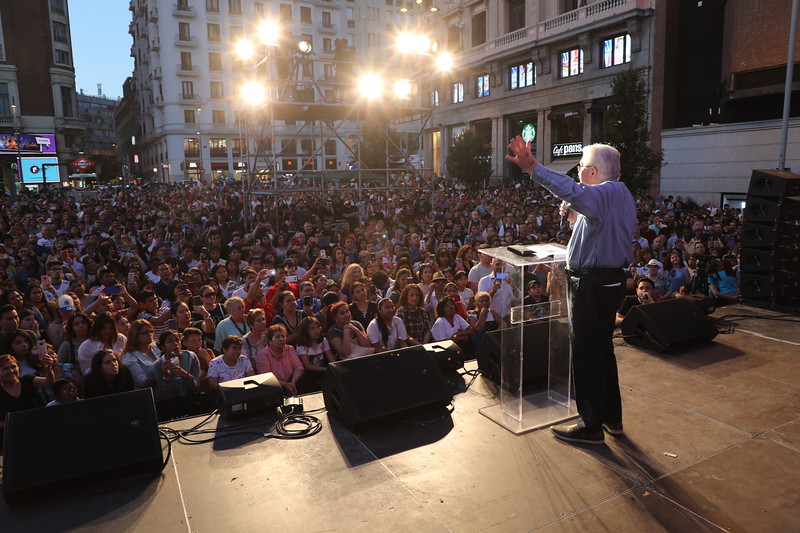 Gracias a las cientos de oraciones contestadas y la bendición de Dios, la ciudad de Madrid fue testigo de la presencia del evangelista internacional Luis Palau, acompañado por su hijo Andrés en el desarrollo del FestiMadrid 2019, con la dirección de festivales, pastor Rubén Proietti (presidente de ACIERA) y el trabajo en unidad de 216 iglesias evangélicas locales y más de 3.000 amigos del festival. Bajo el lema buena música y buenas noticias para toda la familia, ellos junto a artistas nacionales e internacionales protagonizaron el evento que se desarrolló el viernes 21, en la mítica Plaza El Callao, sobre la Gran Vía ylos días 22 y 23 de junio en el Paseo de Camoens, en el Parque del Oeste en la ciudad capital de España, a pocos metros de la Moncloa. Y es asi que después de 18 meses desde que se le diagnosticó cáncer de pulmón, ante el cual lleva un tratamiento médico, el argentino Luis Palau con sus 84 años, se encuentra por segunda vez predicando el Evangelio de Jesucristo en la ciudad de Madrid. La primera había sido en 2005. Y no solo estuvo predicando durante 50 minutos en la cena del día 20 en el Novotel de Madrid ante más de 250 empresarios, deportistas y emprendedores, donde decenas entregaron sus vidas a Cristo, sino también sobre la plataforma principal durante los días centrales del festival.