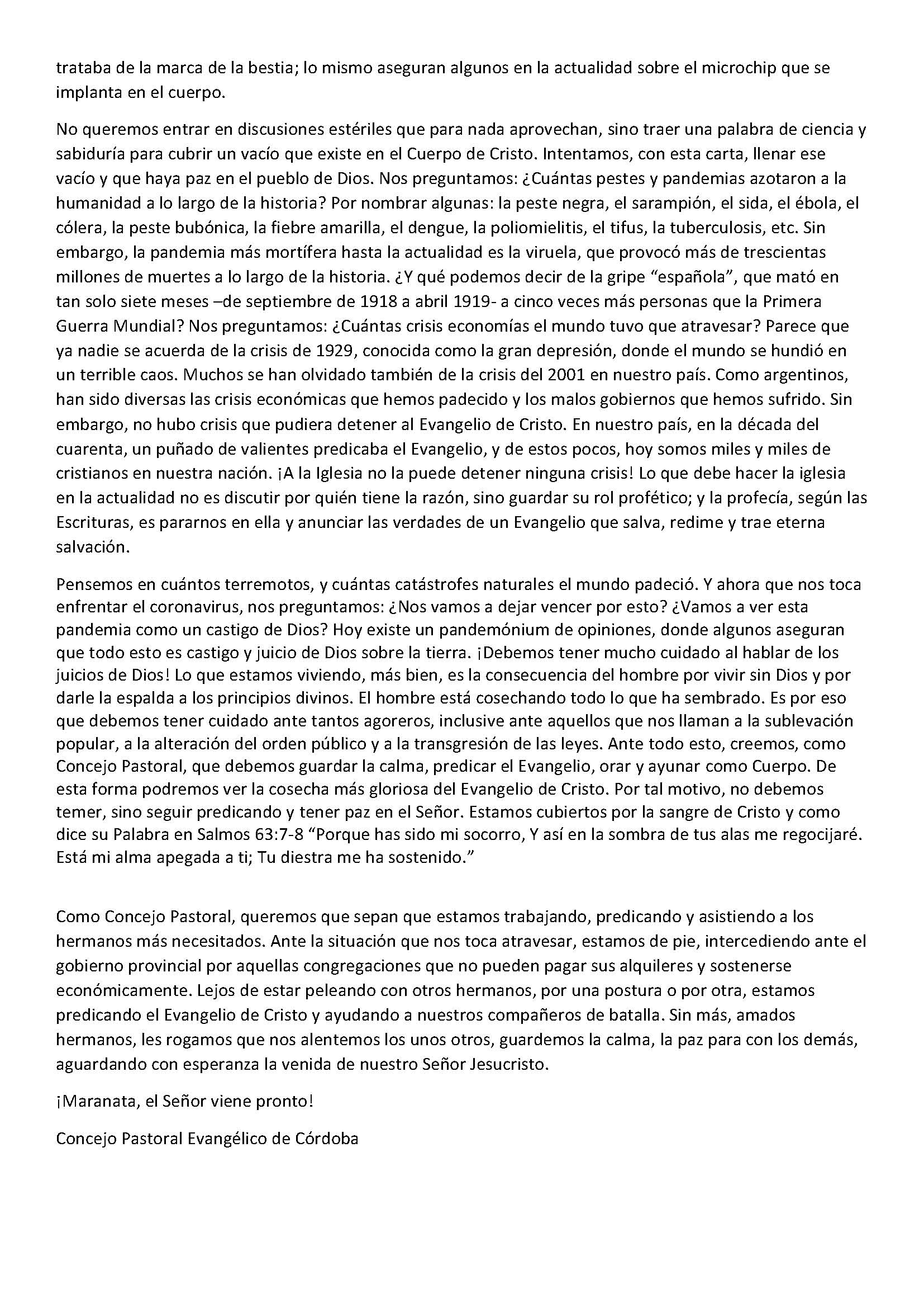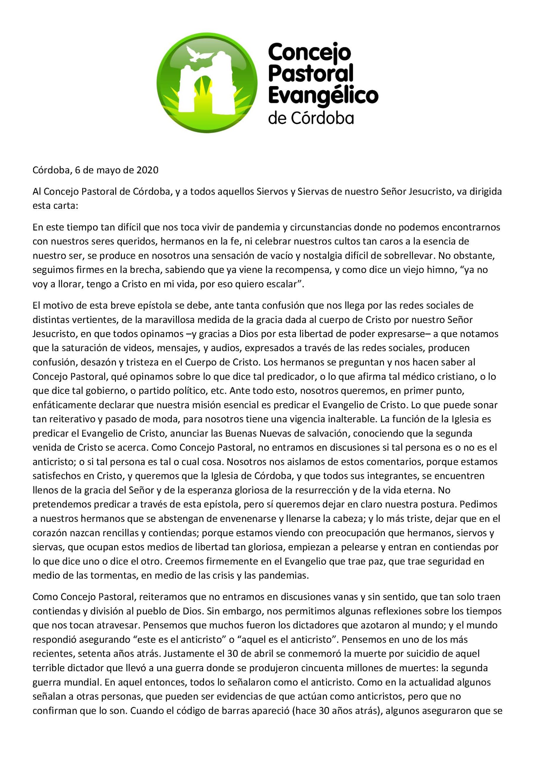ACIERA anima a los consejos pastorales en cada provincia y/o localidad, a considerar la carta del concejo de pastores de la ciudad de Córdoba, como un modelo a replicar en cada lugar. Consideramos que la misma insta a enfocarnos en medio de la pandemia, en la misión que tenemos en predicar el evangelio, ayudar a quienes están en vulnerabilidad, guardando la unidad y creyendo que, a través de la historia, la iglesia se ha mantenido como columna y baluarte de la verdad:
