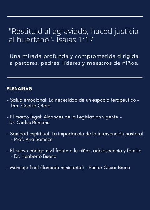 Entre los temas sobresalen: Salud emocional – la necesidad de un espacio terapéutico; el marco legal – alcances de la Legislación vigente; Sanidad Espiritual – la importancia de la intervención pastoral; El nuevo Código Civil frente a la niñez, adolescencia y familia.