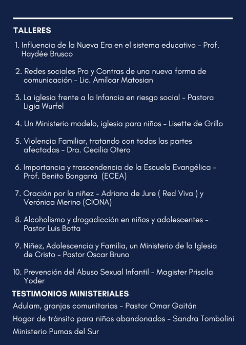 En este espacio los participantes dispondrán de talleres con variadas temáticas: Influencia de la nueva era en el sistema educativo – Redes Sociales: Pro y contras de una nueva forma de comunicación; un ministerio modelo, iglesia para niños; violencia familiar, tratando todas las partes afectadas; importancia y trascendencia de la Escuela Evangélica; oración por la niñez CIONA; Alcoholismo y drogadicción en niños y adolescentes; Niñez, adolescencia y familia, un ministerio de la iglesia de Cristo.
