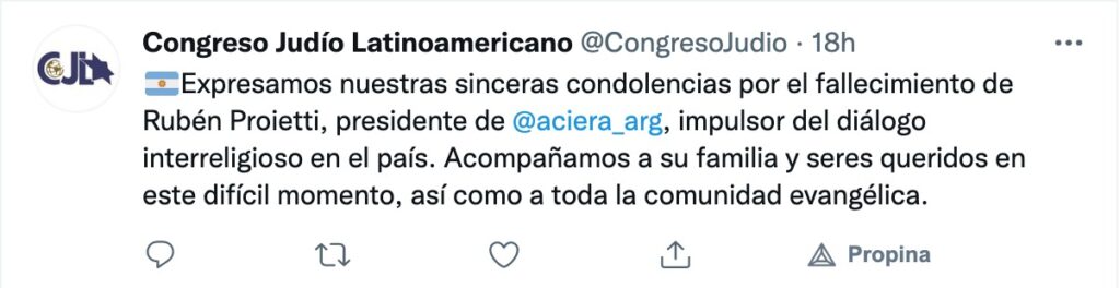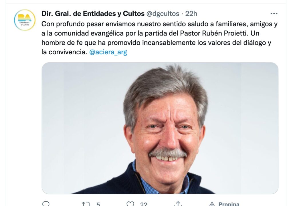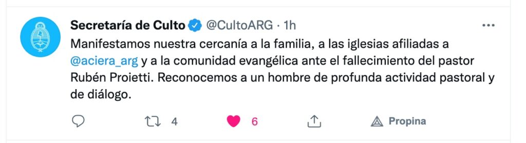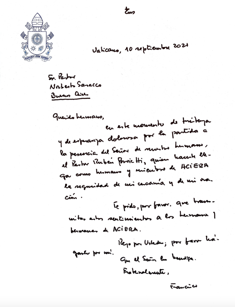 Buenos Aires, 14 de septiembre 2021 — Luego que se conociera la partida a la patria celestial del pastor Rubén Proietti, presidente de ACIERA, una abrumadora cantidad de cartas, comunicados, posteos en las redes sociales conteniendo condolencias para la familia Proietti y para la Alianza Cristiana de Iglesias Evangélicas de la República Argentina. Entre las más destacadas la del Sr. Presidente de la Nación, Alberto Fernández, como la del Sr. Ex Presidente de la Nación, Mauricio Macri, diferentes entidades, personalidades, autoridades nacionales e internacionales, incluyendo a Francisco con una misiva de su puño y letra y el Secretario General de la OEA (Organización de Estados Americanos), Luis Almagro.