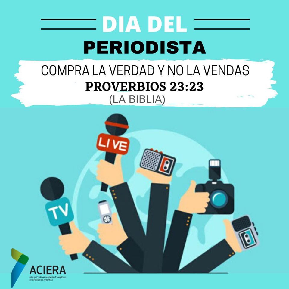 La Alianza Cristiana de Iglesias Evangélicas de la República Argentina felicita al periodismo por desarrollar su labor con vocación y esfuerzo, exponiéndose ante el riesgo de la pandemia, para que la noticia llegue a los hogares en tiempo y forma. Los animamos a continuar por la buena senda de comunicar con transparencia teniendo como valor la verdad.
