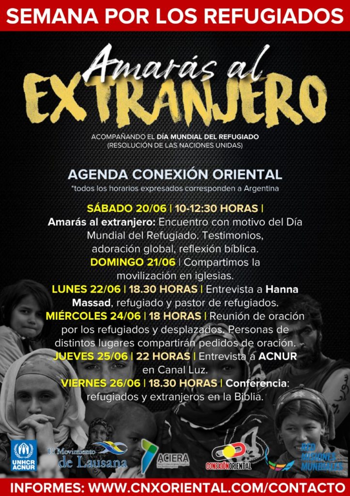 La Red Misiones Mundiales y Conexión Oriental, junto con el Movimiento Lausana y ACIERA, invitan a la iglesia argentina a participar del “Día Mundial del Refugiado” que tendrá lugar el 20 de Junio –según fue establecido en 2001 por la ONU–. Así se busca hacer visible a las personas que viven en condición de desplazamiento forzoso en el mundo. Agenda de actividades.