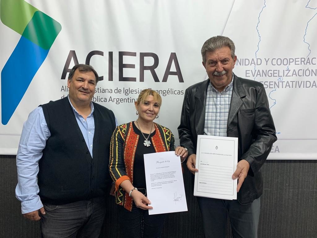 El lunes 25 de noviembre, jornada en que se celebró el Día Internacional de la Libertad Religiosa, la Diputada Nacional Alicia Soraire, autora del proyecto de Ley denominado “Día de la Libertad Religiosa”, el cual cuenta con media sanción de Diputados, entregó al Presidente de ACIERA, pastor Rubén Proietti, la carpeta que contiene el texto íntegro de dicho proyecto, sus fundamentos, y las presentaciones realizadas oportunamente al titular de la Cámara de Diputados de la Nación, Dr. Emilio Monzó, el pasado 8 de abril.