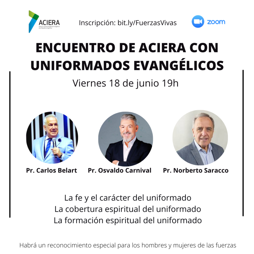 Buenos Aires, 3 de Junio de 2021 — La Alianza Cristiana de Iglesias Evangélica de la República Argentina (ACIERA) tendrá una reunión mediante zoom, con cristianos evangélicos que pertenecen a las diferentes fuerzas armadas y fuerzas de seguridad del país con el fin de confraternizar, orar, tener un tiempo especial con cada uno de ellos y rendir un homenaje merecido por la labor que desarrollan. La reunión será el viernes 18 de Junio a las 19hs. y podrán asistir mediante inscripción previa en http://bit.ly/FuerzasVivas.