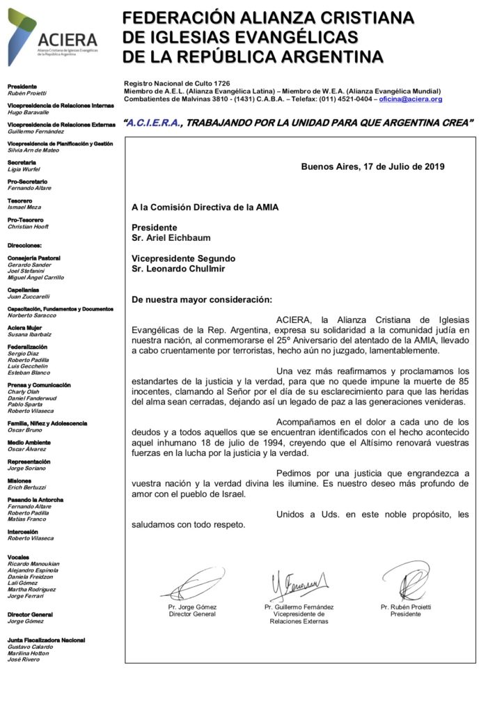 Entre los presentes, asistió en nombre de ACIERA, su vicepresidente de Relaciones Externas, Guillermo Fernández. Previo al acto, el representante de la Alianza participó de un desayuno con autoridades anfitrionas, de Gobierno, y distintos actores sociales, e hizo entrega en mano al presidente de la AMIA, Ariel Eichbaum, una misiva de solidaridad y acompañamiento de ACIERA con cada uno de los deudos.