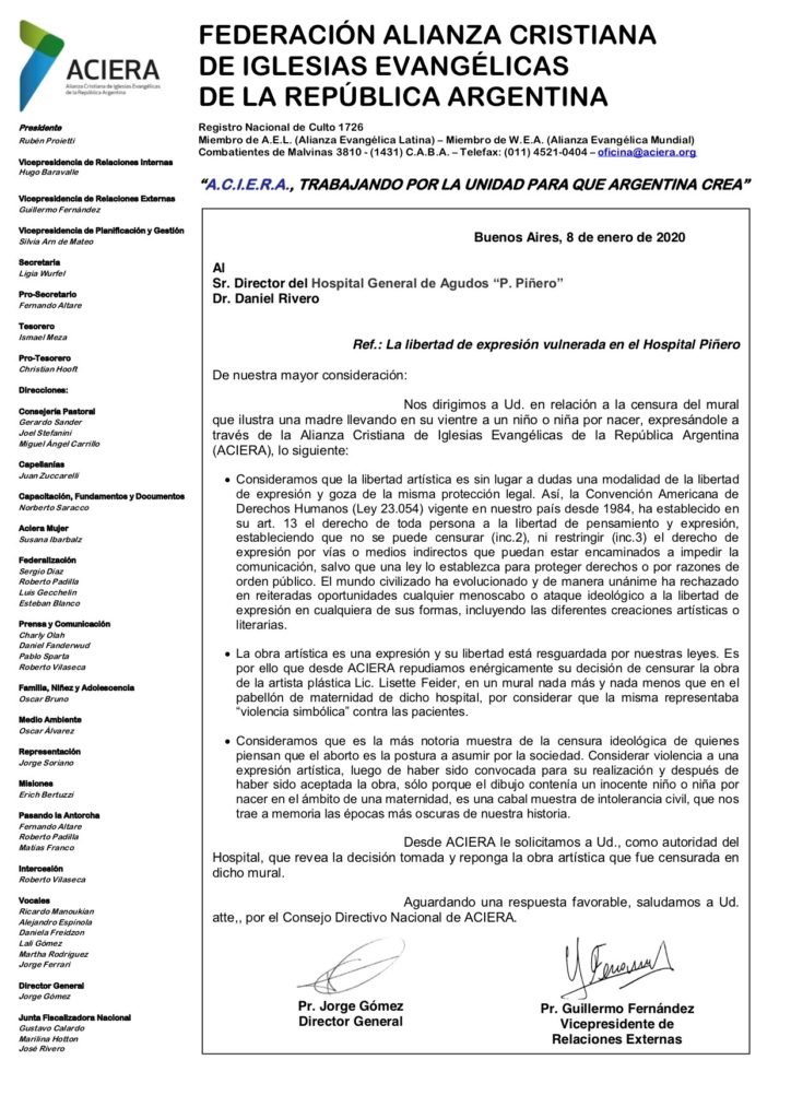 La obra artística es una expresión y su libertad está resguardada por nuestras leyes. Es por ello que, desde ACIERA repudiamos enérgicamente la decisión del Director del Hospital Piñero, Daniel Rivero, de censurar la obra de la artista plástica Lic. Lisette Feider en un mural nada más y nada menos que en el pabellón de maternidad de dicho hospital, por considerar que la misma representaba “violencia simbólica” contra las pacientes.