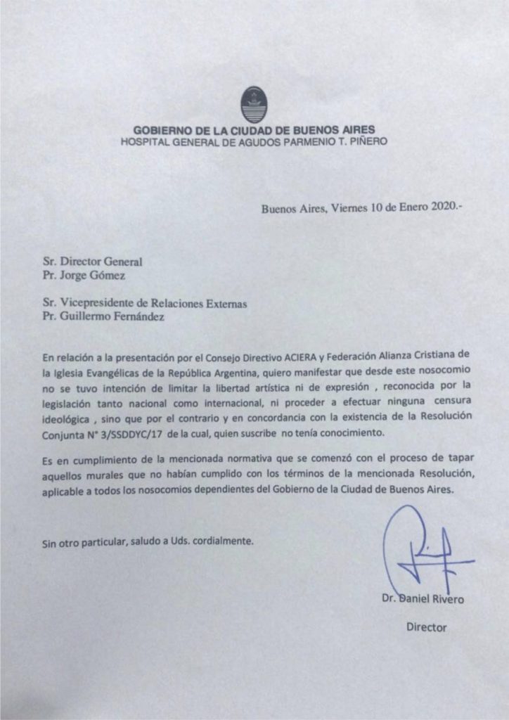 Carta de ACIERA al director del Hospital Piñero y su respuesta: