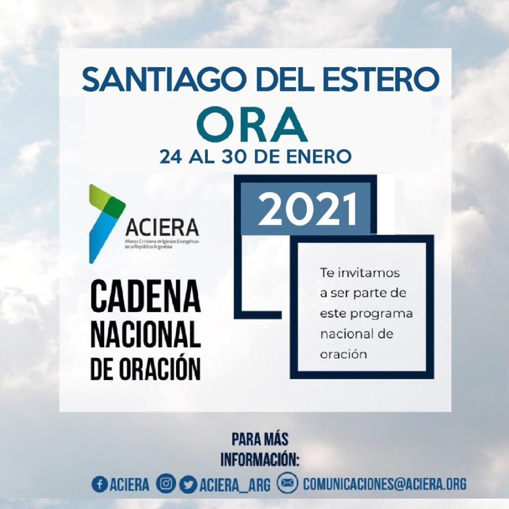 Proseguimos con un nuevo periodo de la Cadena Nacional de Oración para este 2021. En donde cada provincia o región ora, por el espacio de una semana, por el país y su provincia. Entre los temas generales de oración se enumeran: el creciente aumento de casos por COVID-19 en todo el país, la crisis económica que trae pobreza y el desempleo, la inseguridad, la niñez y los adultos mayores, como así también la obra de las iglesias evangélicas realizan a lo largo y ancho de todo el territorio nacional.