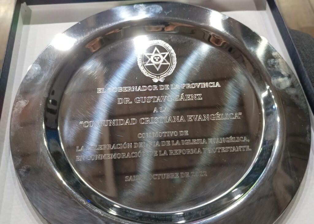 El gobernador Gustavo Saenz reconoció a las Iglesias Evangélicas por el Día de la Reforma mediante una placa conmemorativa.
