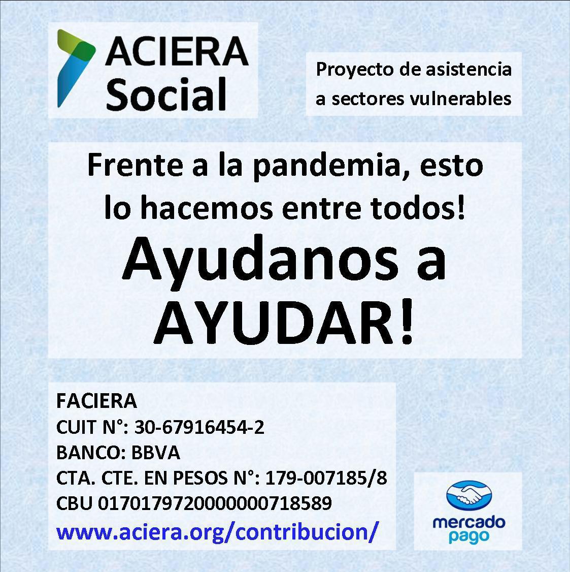 Convenio entre ACIERA y el Ministerio de Desarrollo Social de la Nación: la Alianza se encuentra llevando adelante acciones para la firma de un convenio con esta cartera para la compra de alimentos y elementos de limpieza para ser entregados en diferentes zonas en situación de vulnerabilidad. A través de dicho convenio el organismo mencionado ha solicitado a ACIERA que en primera instancia dicha entrega se lleve a cabo en el GRAN CÓRDOBA, para lo cual el Consejo de Pastores de la ciudad de Córdoba, presidido por el pastor Carlos Belart (miembro del Consejo Directivo de ACIERA) llevarán adelante dicha función.
