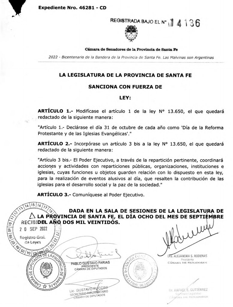 Buenos Aires, 11 de octubre de 2022 — Fue sancionada y publicada en el Boletín Oficial con fecha 5 de octubre la nueva Ley de la provincia de Santa Fe que establece que cada 31 de Octubre se conmemorará el “Día de la Reforma Protestante y de las Iglesias Evangélicas”, constituyéndose así en la décimo cuarta provincia argentina que adopta esta medida en reconocimiento a la presencia y labor de las diferentes iglesias evangélicas en nuestro país.