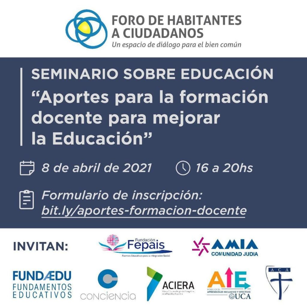 Buenos Aires, 6 de abril 2021 — El Foro de Habitantes a Ciudadanos, a través de su Mesa de Educación, integrada por diferentes organizaciones de la sociedad civil, entre ellas ACIERA, invita a Docentes de todos los niveles y modalidades, y a estudiantes de las diferentes carreras docentes, al SEMINARIO Online que se llevará a cabo el día 8 de abril del corriente año, a partir de las 16 hs. bajo el lema: Aportes a la formación docente para mejorar la educación.