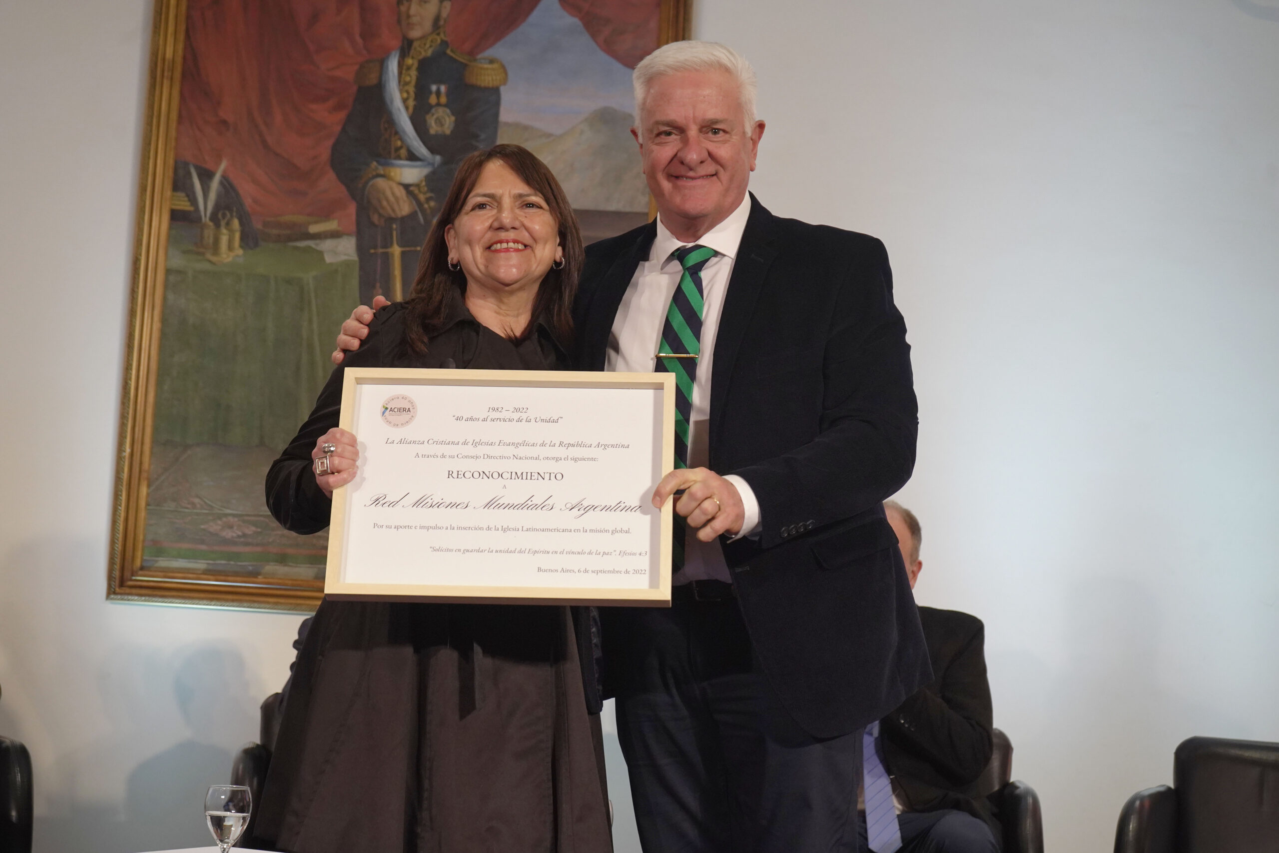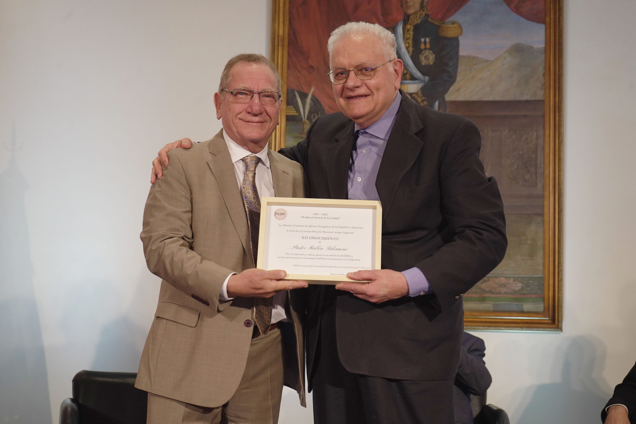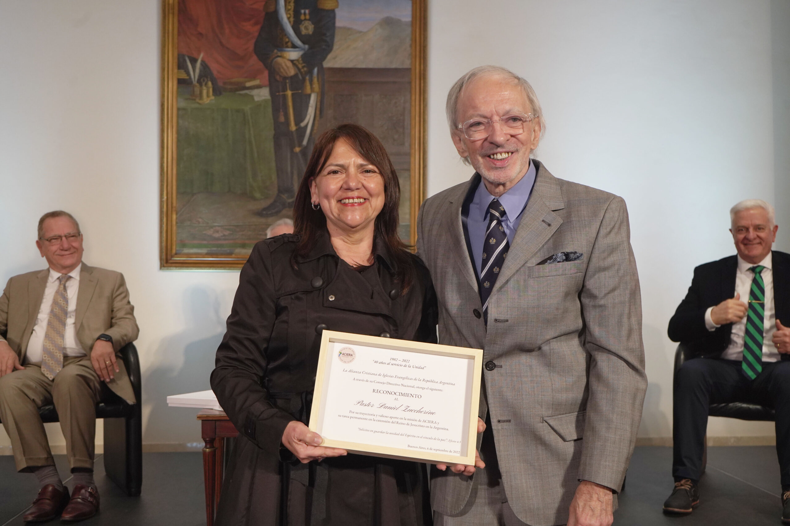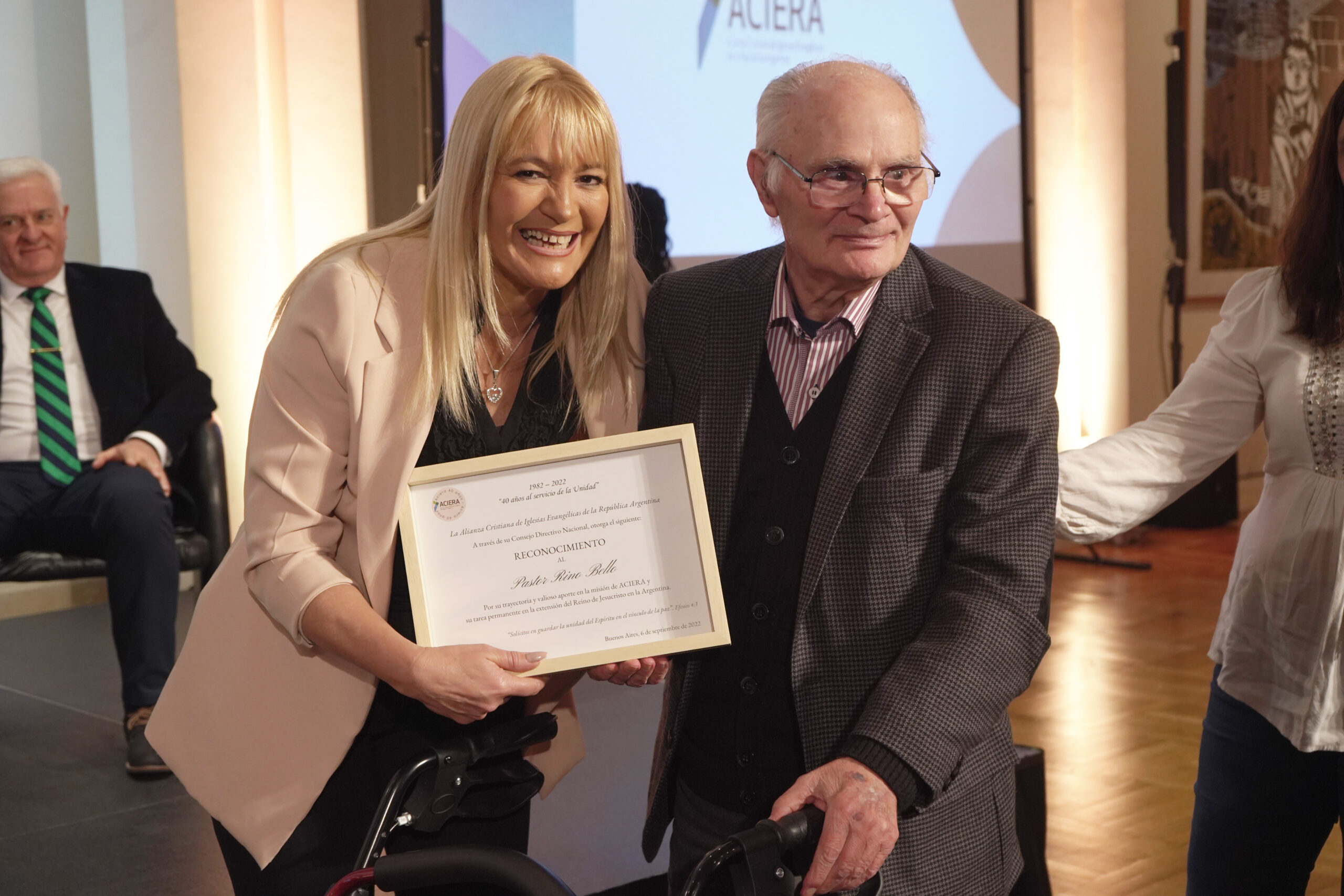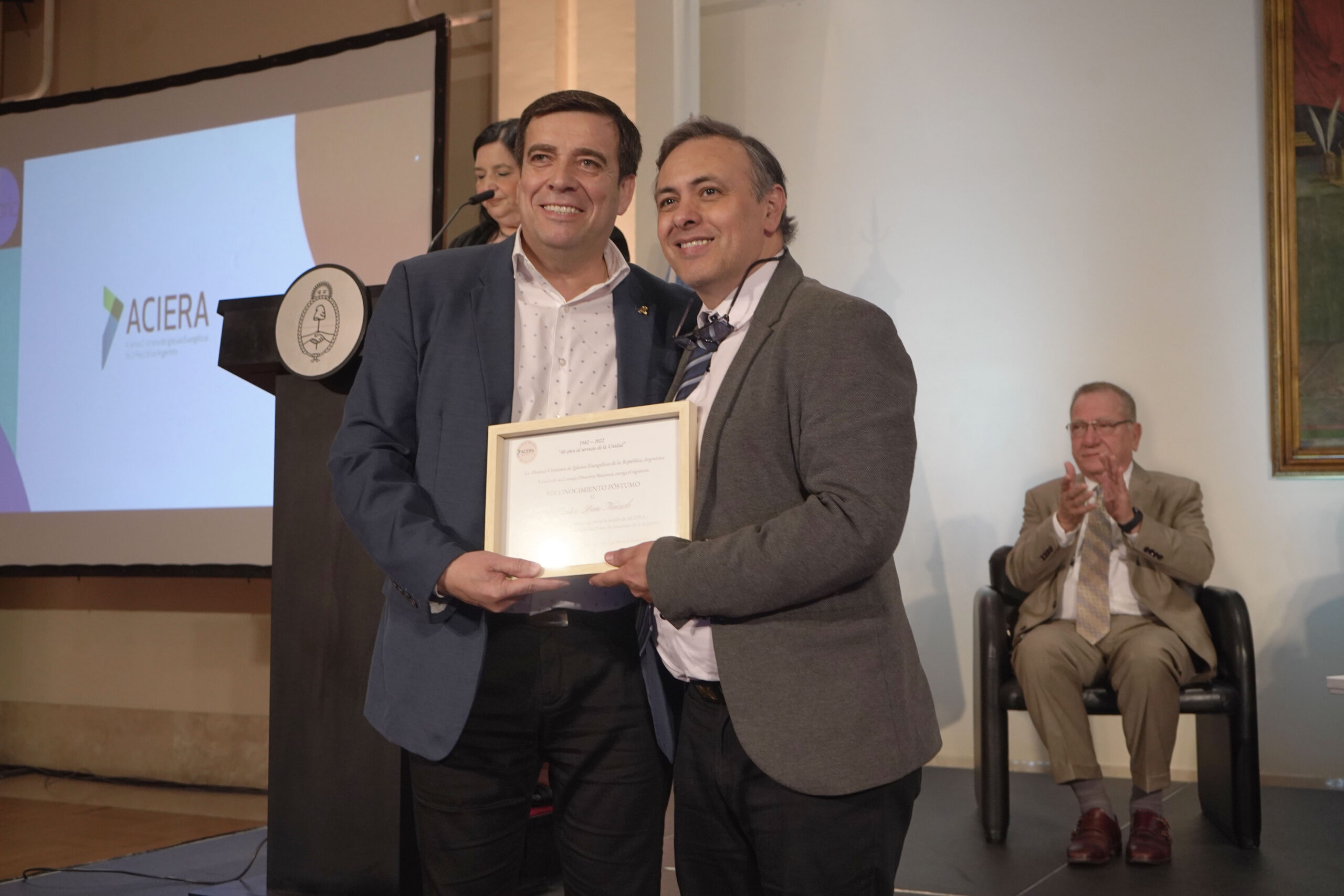 Por supuesto hubo un reconocimiento póstumo a Rubén Proietti, quien fuera presidente de ACIERA por más de 17 años. El aplauso fue contundente por el servicio que Proietti brindó a Dios y a la Iglesia. La placa fue entregada por el pastor Christian Hooft, presidente actual de ACIERA, y recibida por su esposa Adriana Fasanelli y su hijo menor, Jonatan.