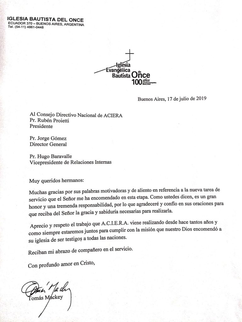 Carta de agradecimiento del pastor Tomás Mackey, miembro fundador de ACIERA, ante la felicitación recibida ante su nombramiento al frente de la Alianza Mundial Bautista: